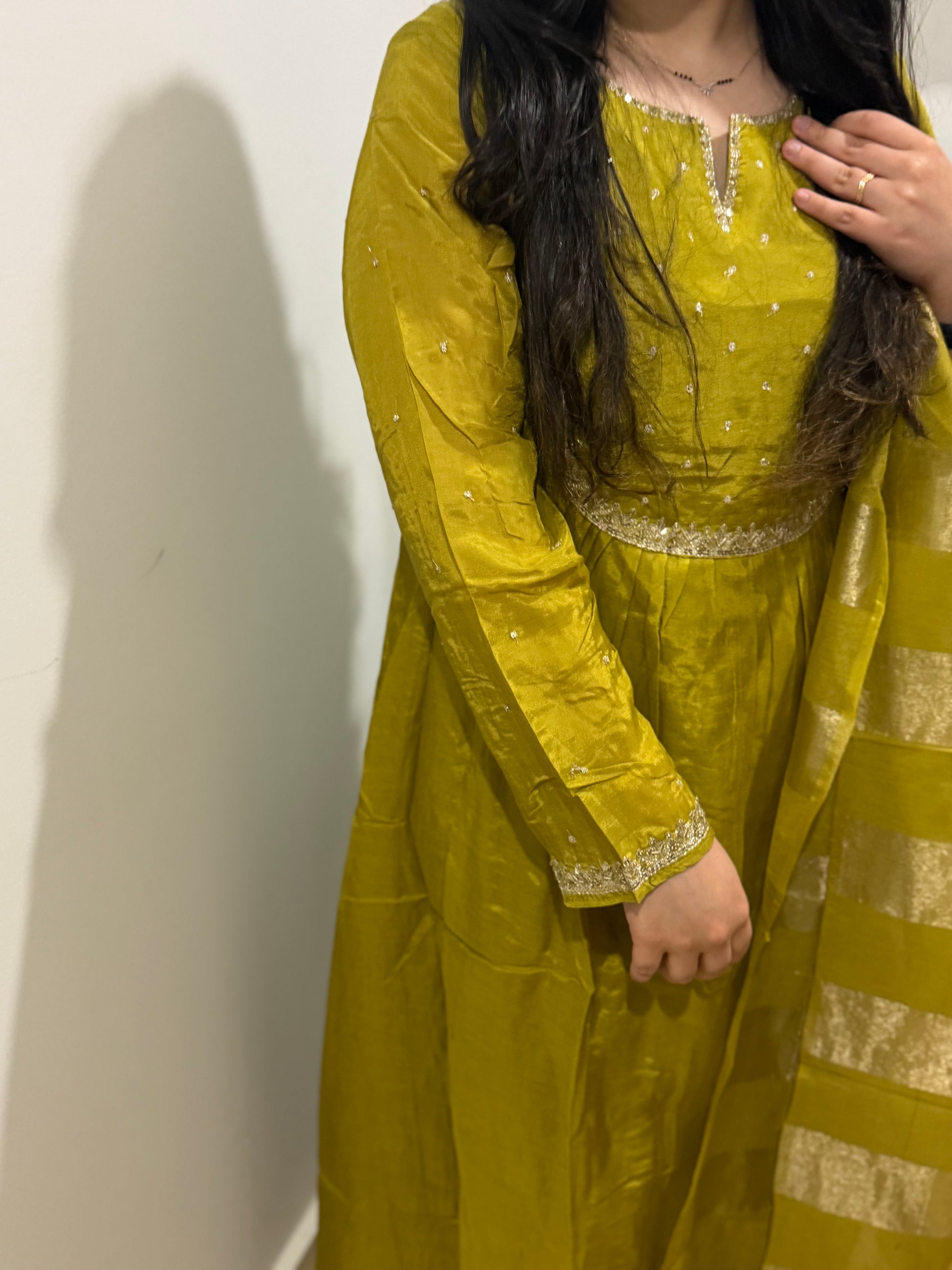 Premium quality mul chanderi anarkali suit with lining and handwork on the yoke and sleeves. Luxury dupatta on mul chanderi fabric and straight pants