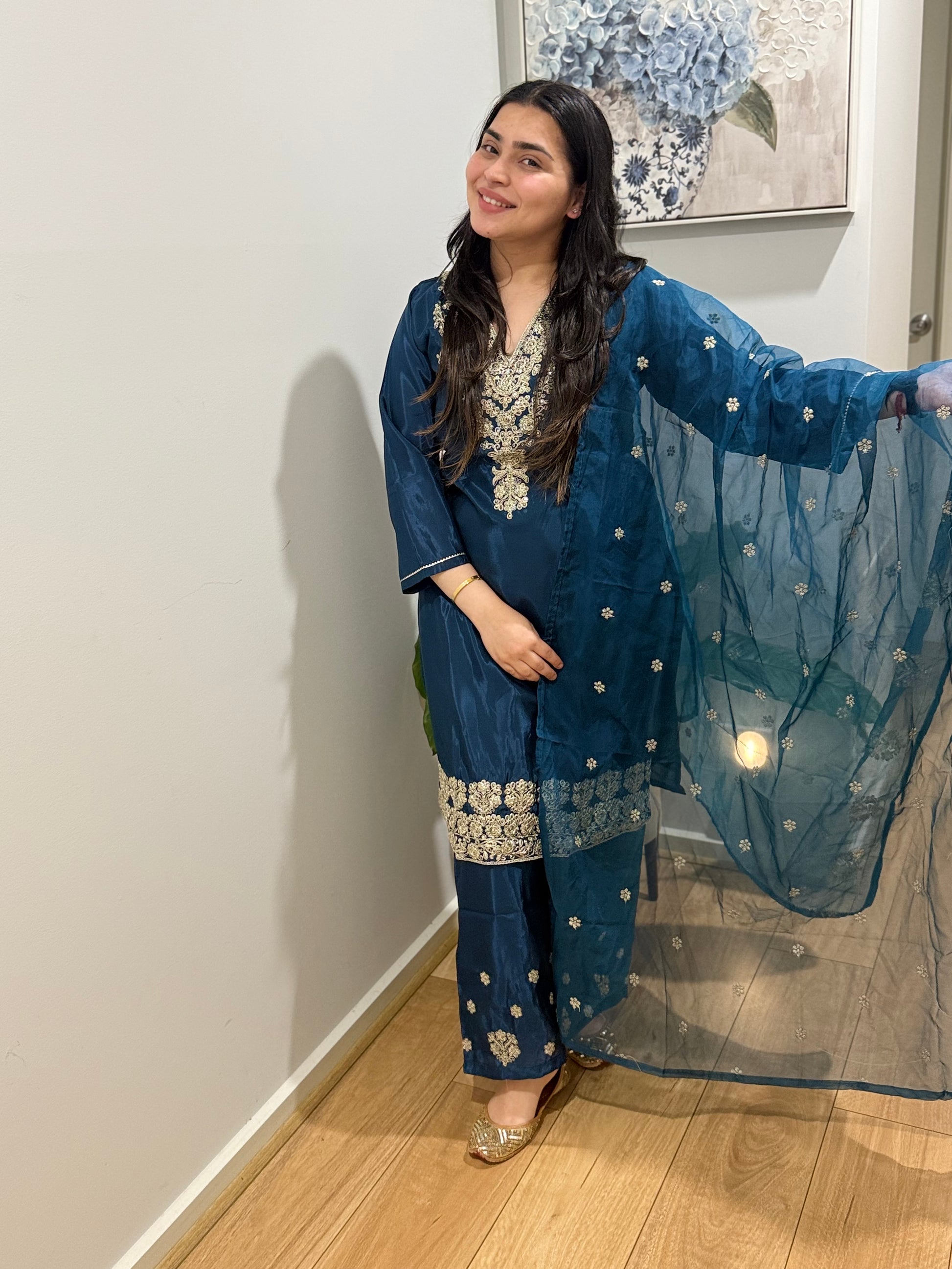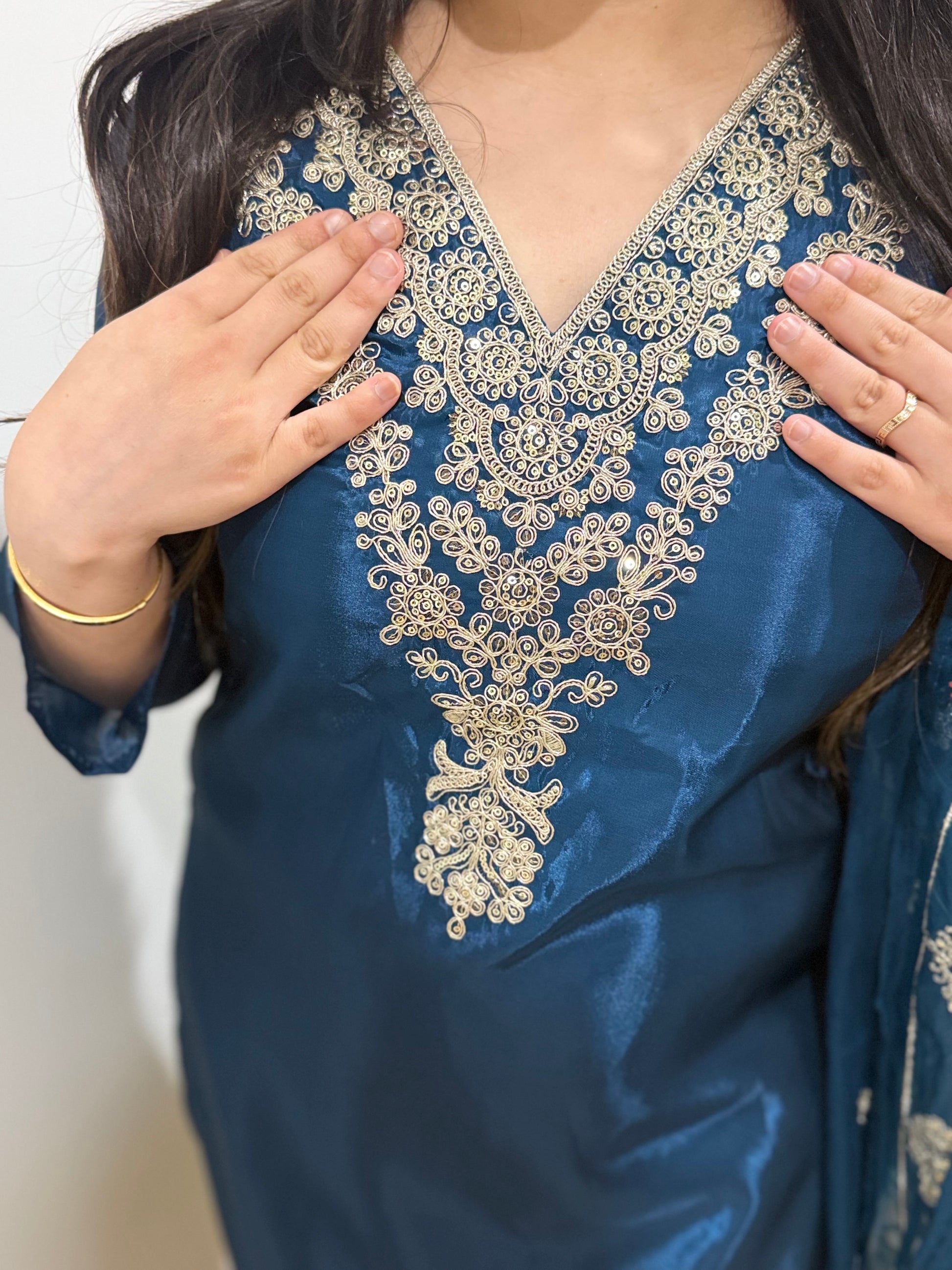 Premium quality jimmychootissue suit with pants and organza dupatta