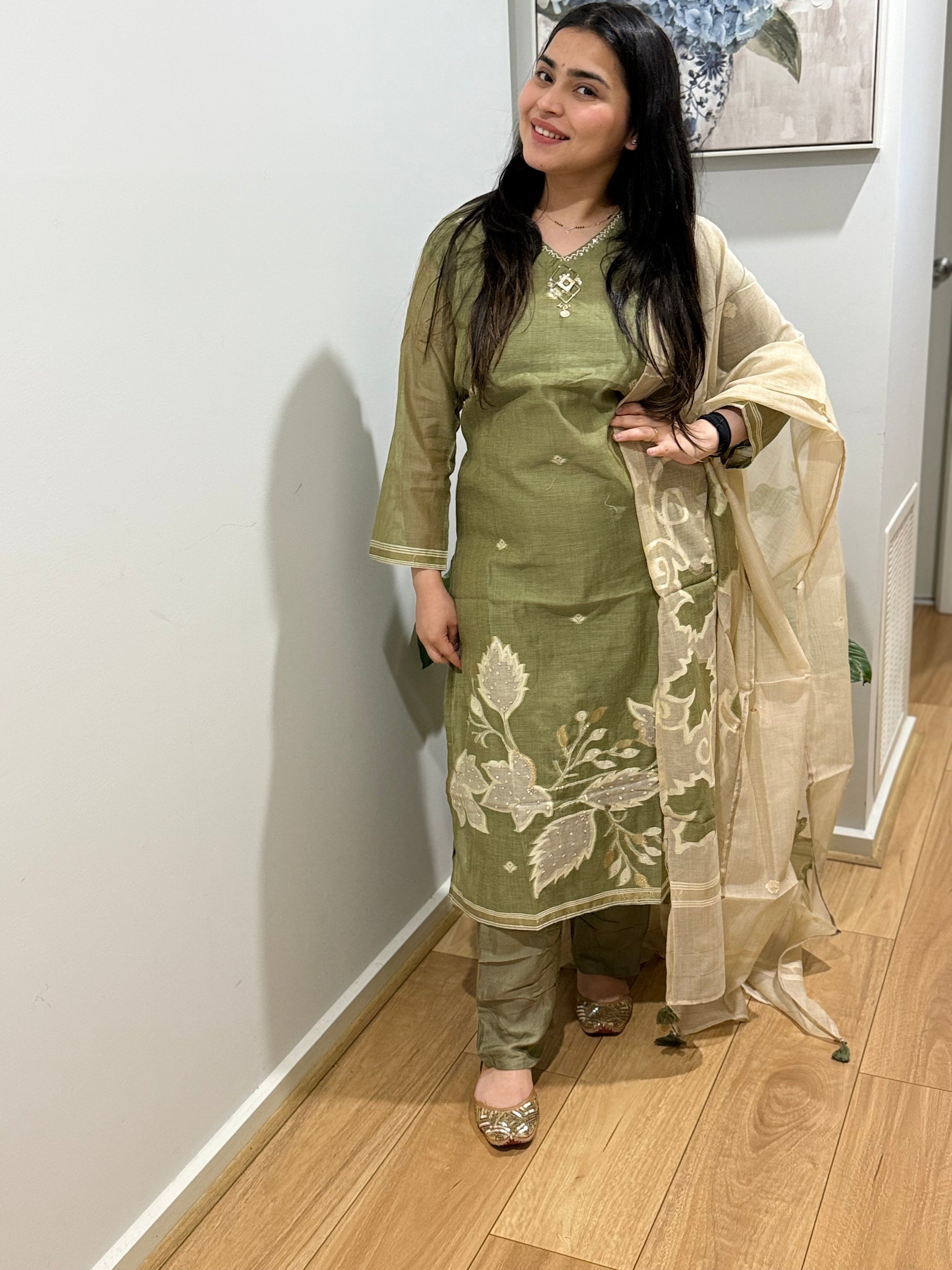 Premium quality mul chanderi suit with pants and mulchanderi dupatta