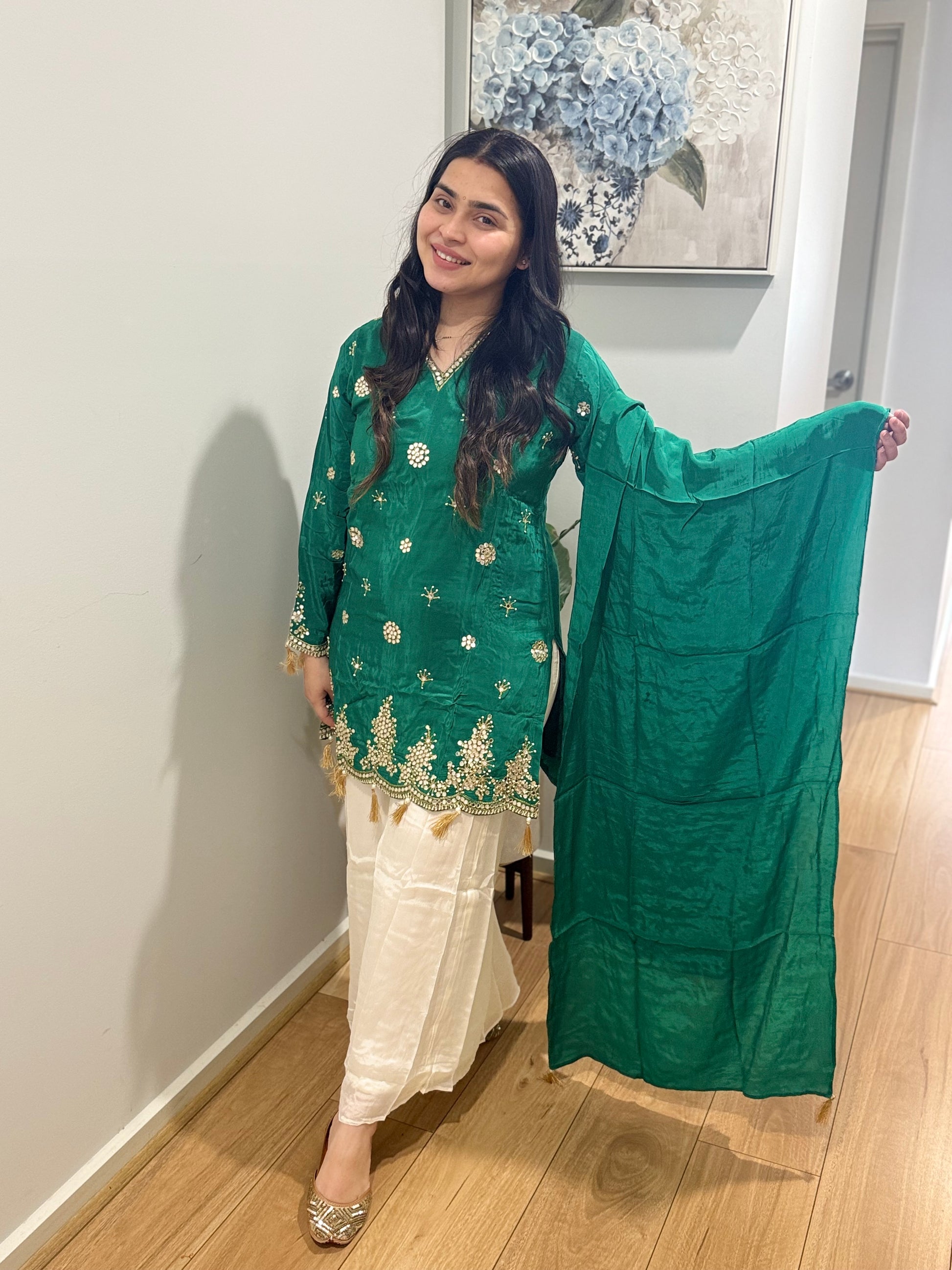 Premium quality satin silk short top with bell sleeves and chiffon plazzo and dupatta