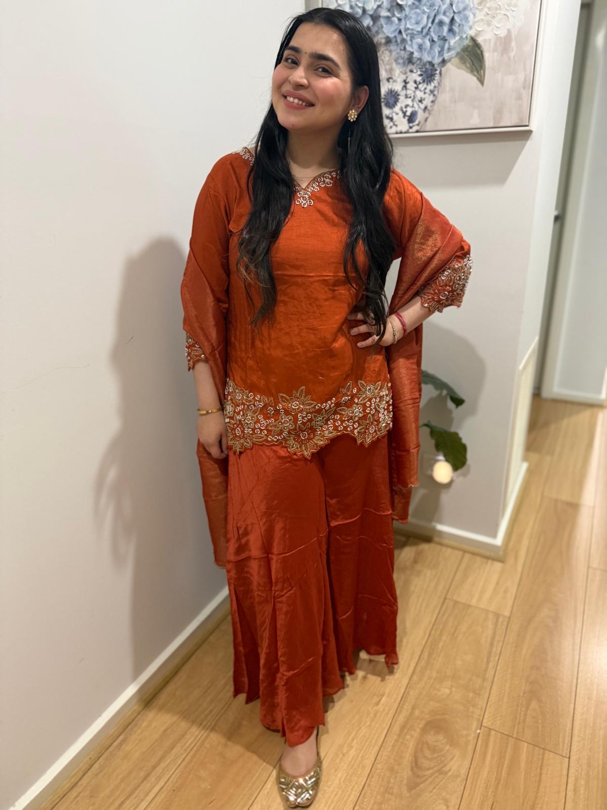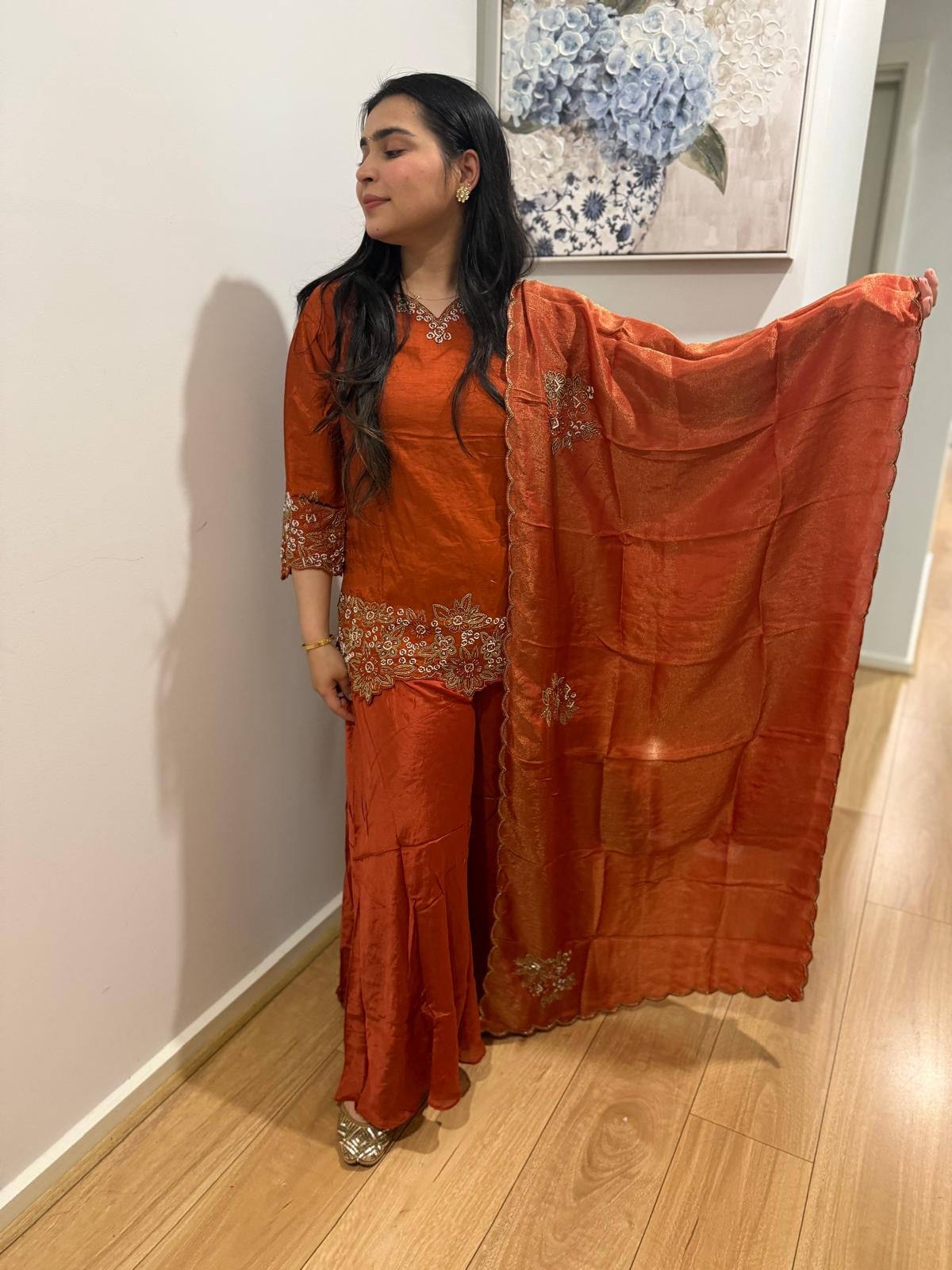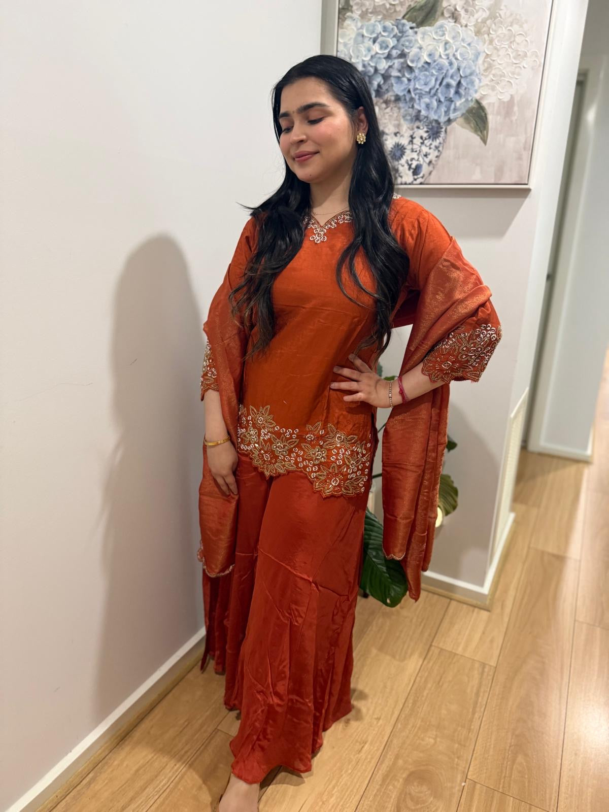 Pure dola silk suit with lining, handwork and chiffon plazzo and dupatta