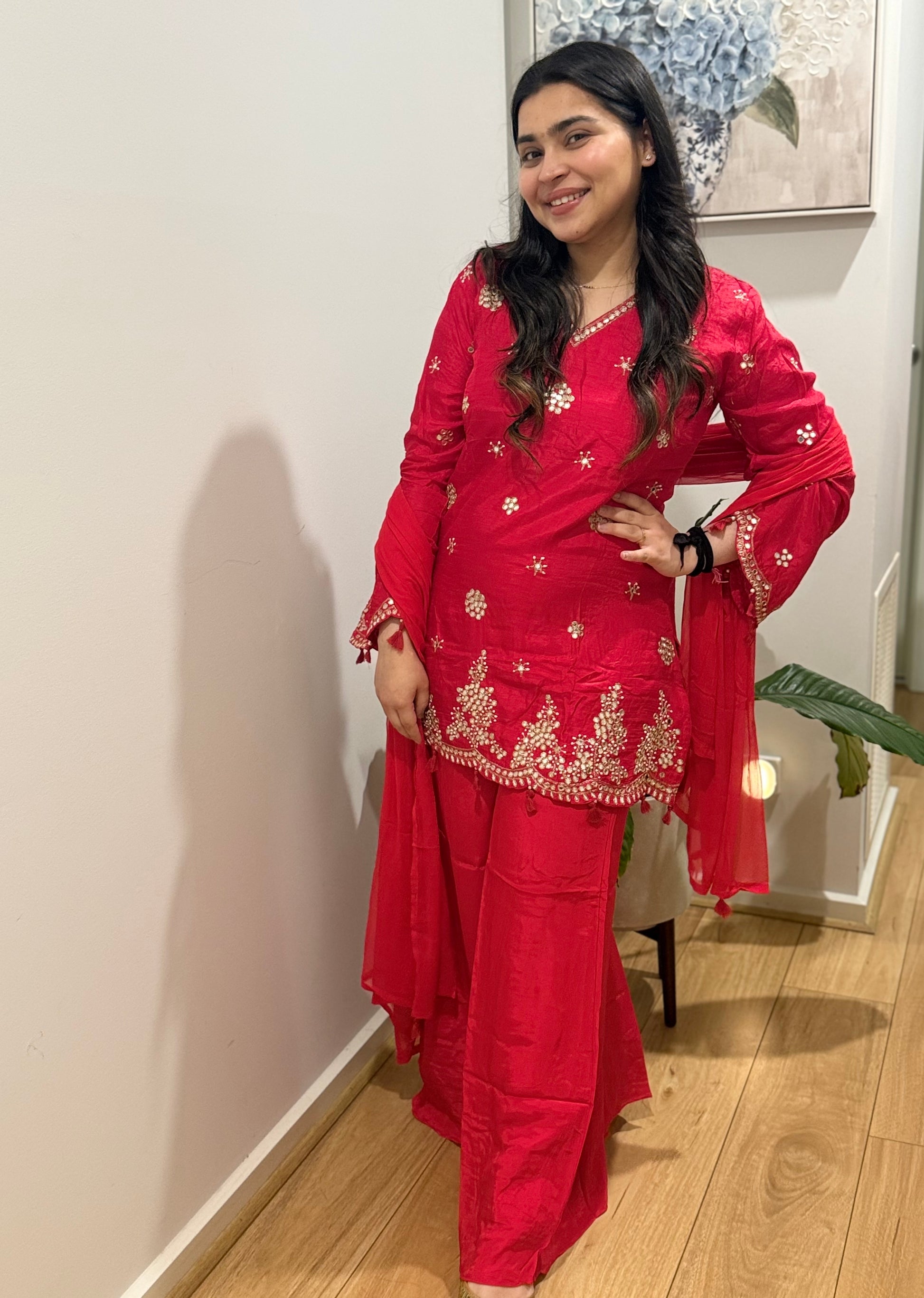 Premium quality silk short top with bell sleeves and chiffon plazzo and dupatta