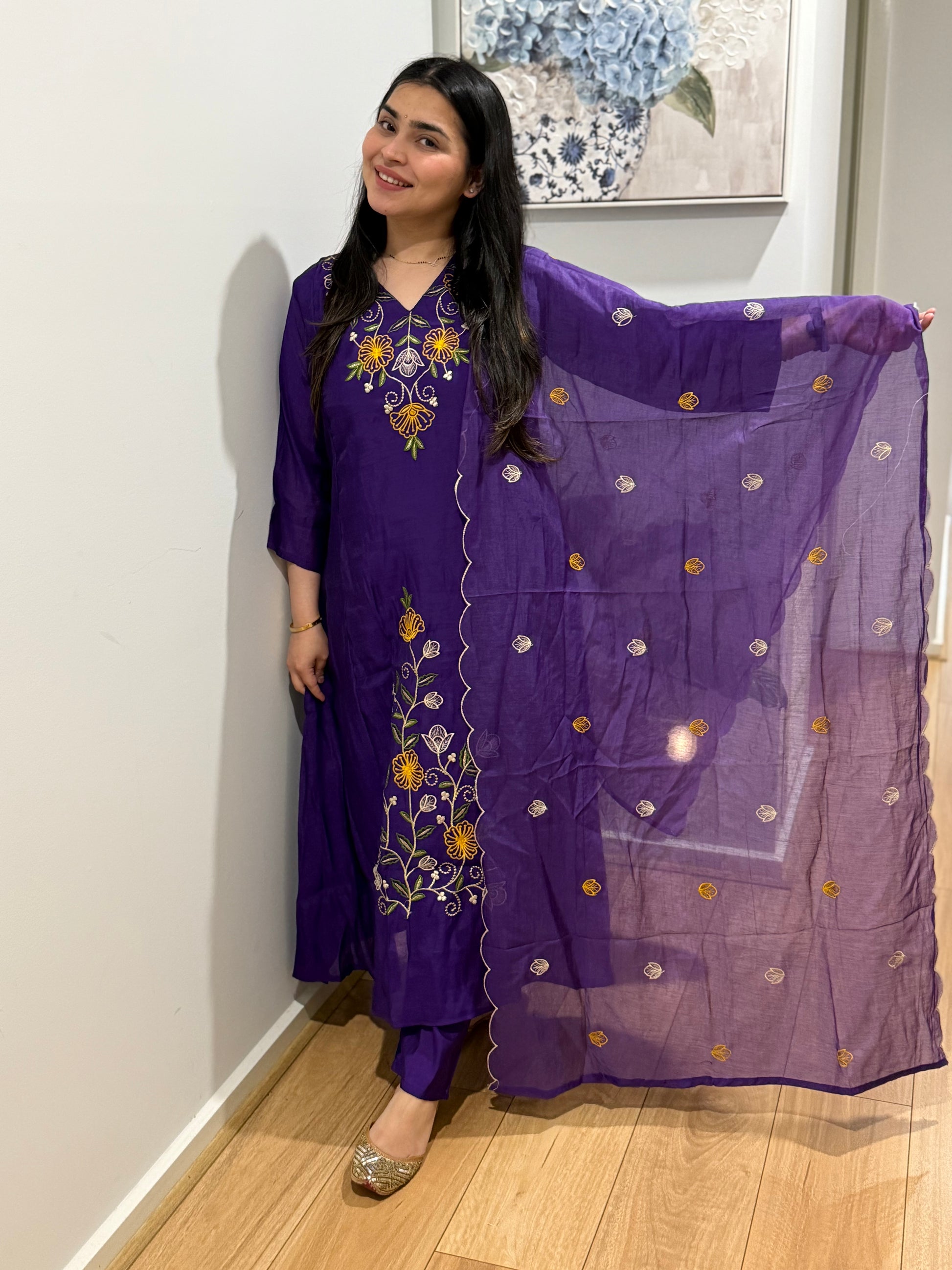 Premium quality muslin silk aline suit with lining and embroidery on the yoke and sleeves. Luxury dupatta on muslin fabric and straight pants