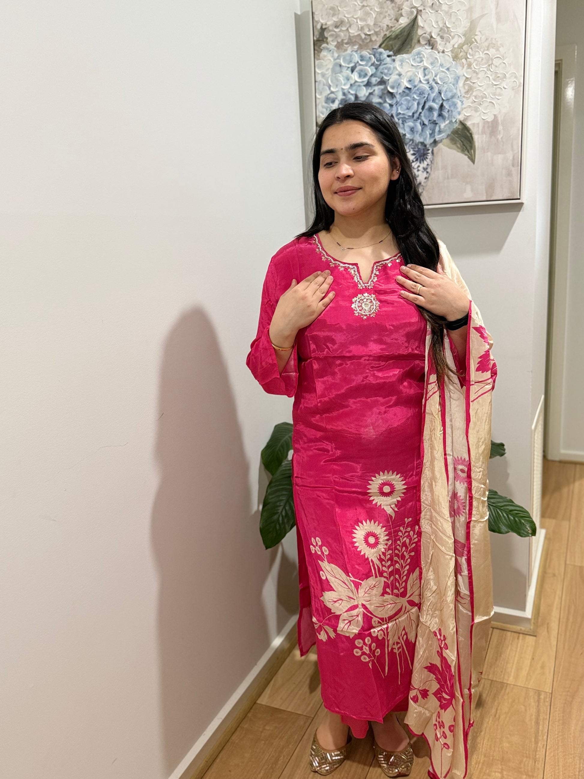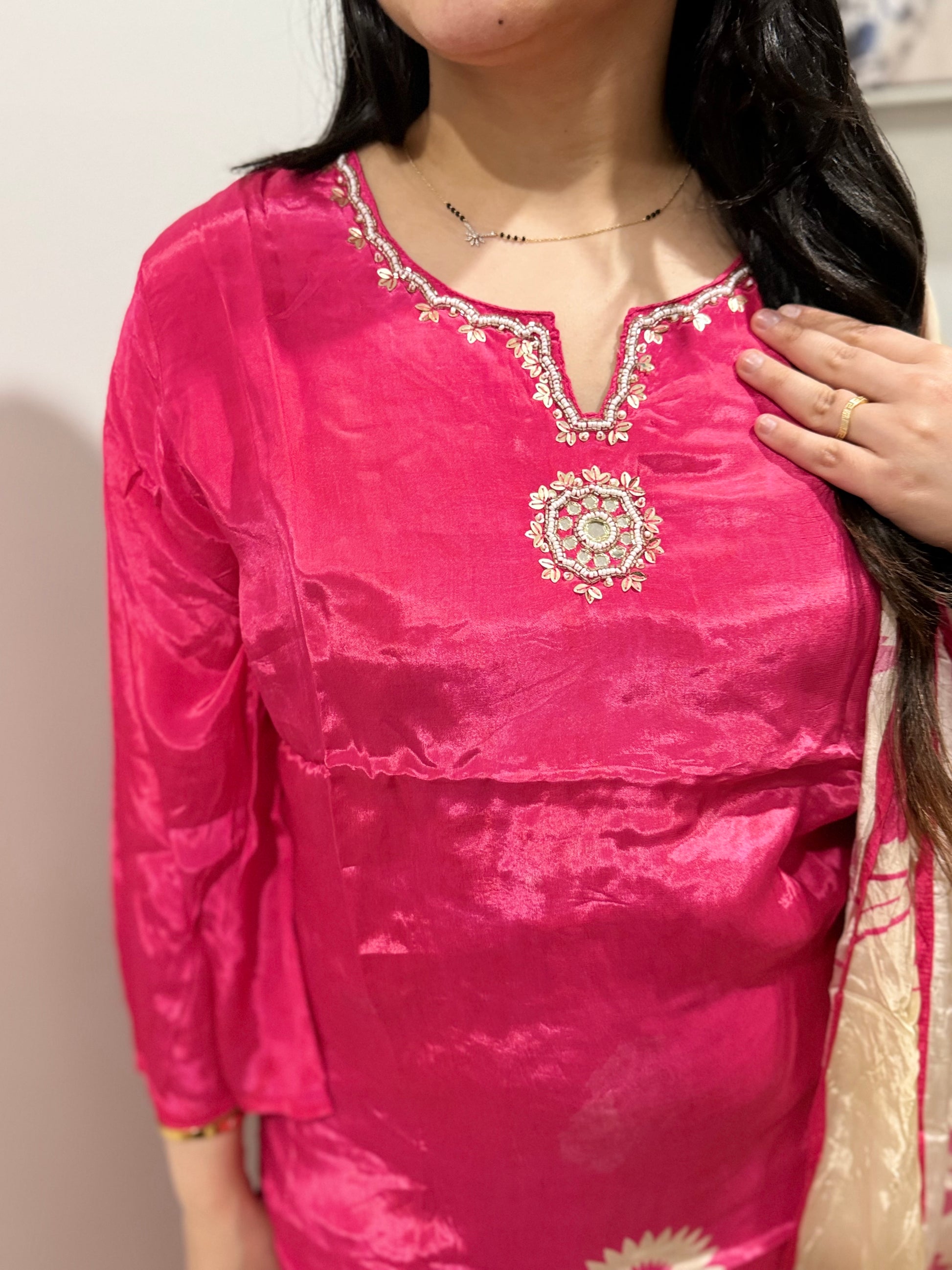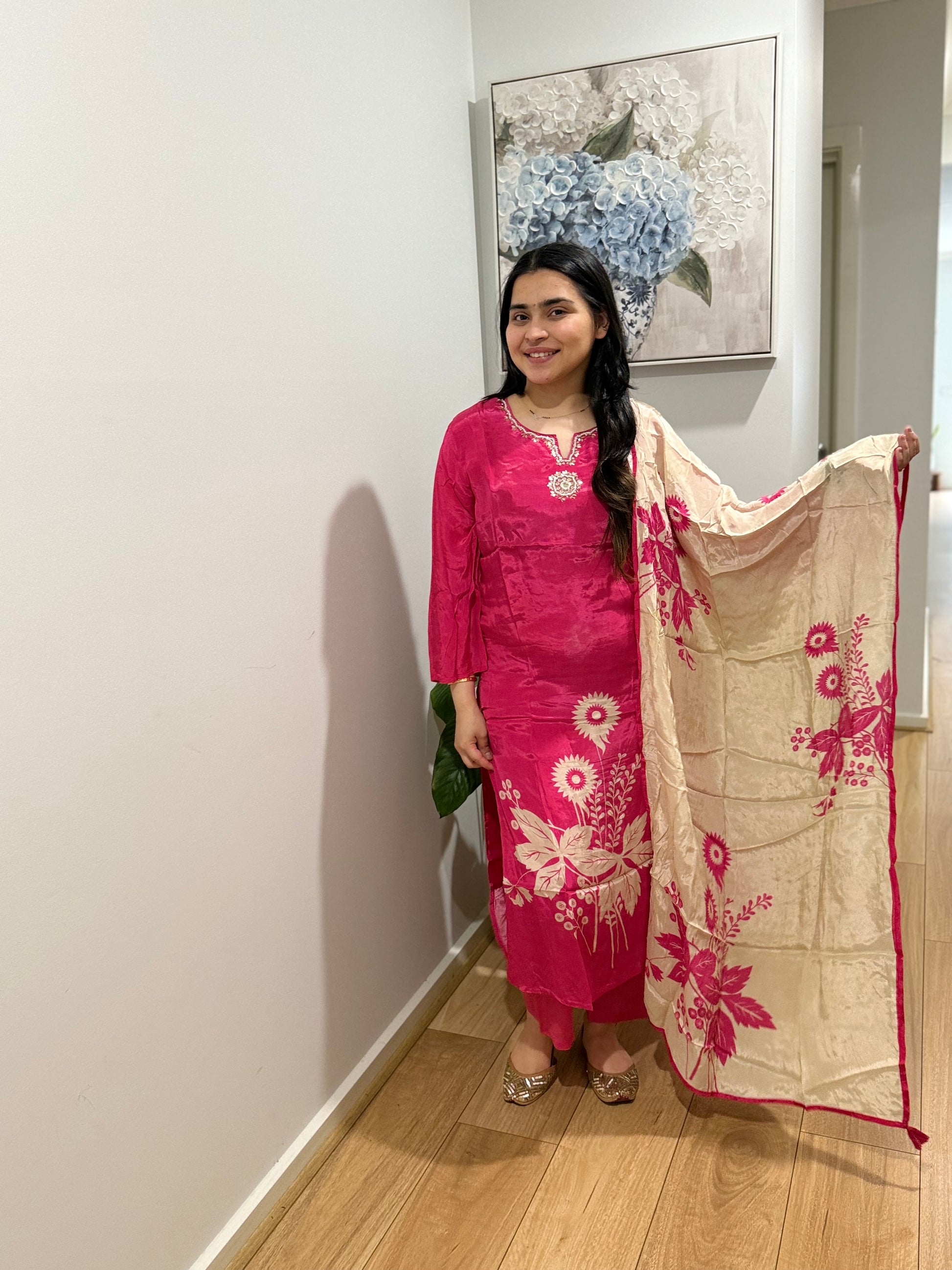 Premium quality natural crape suit with lining and handwork on the yoke and sleeves. Luxury dupatta on crape fabric
