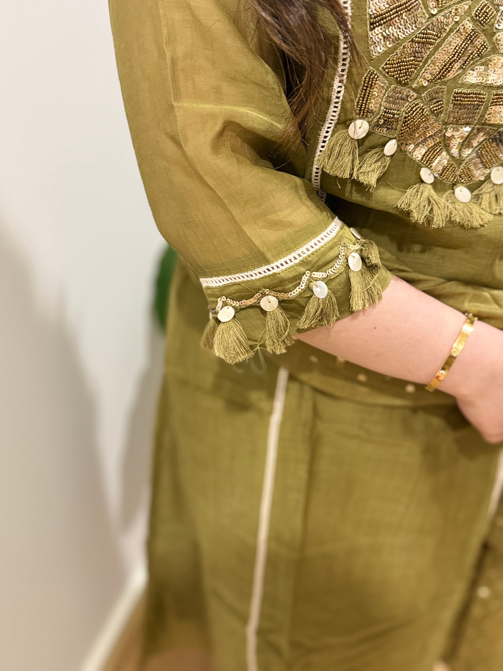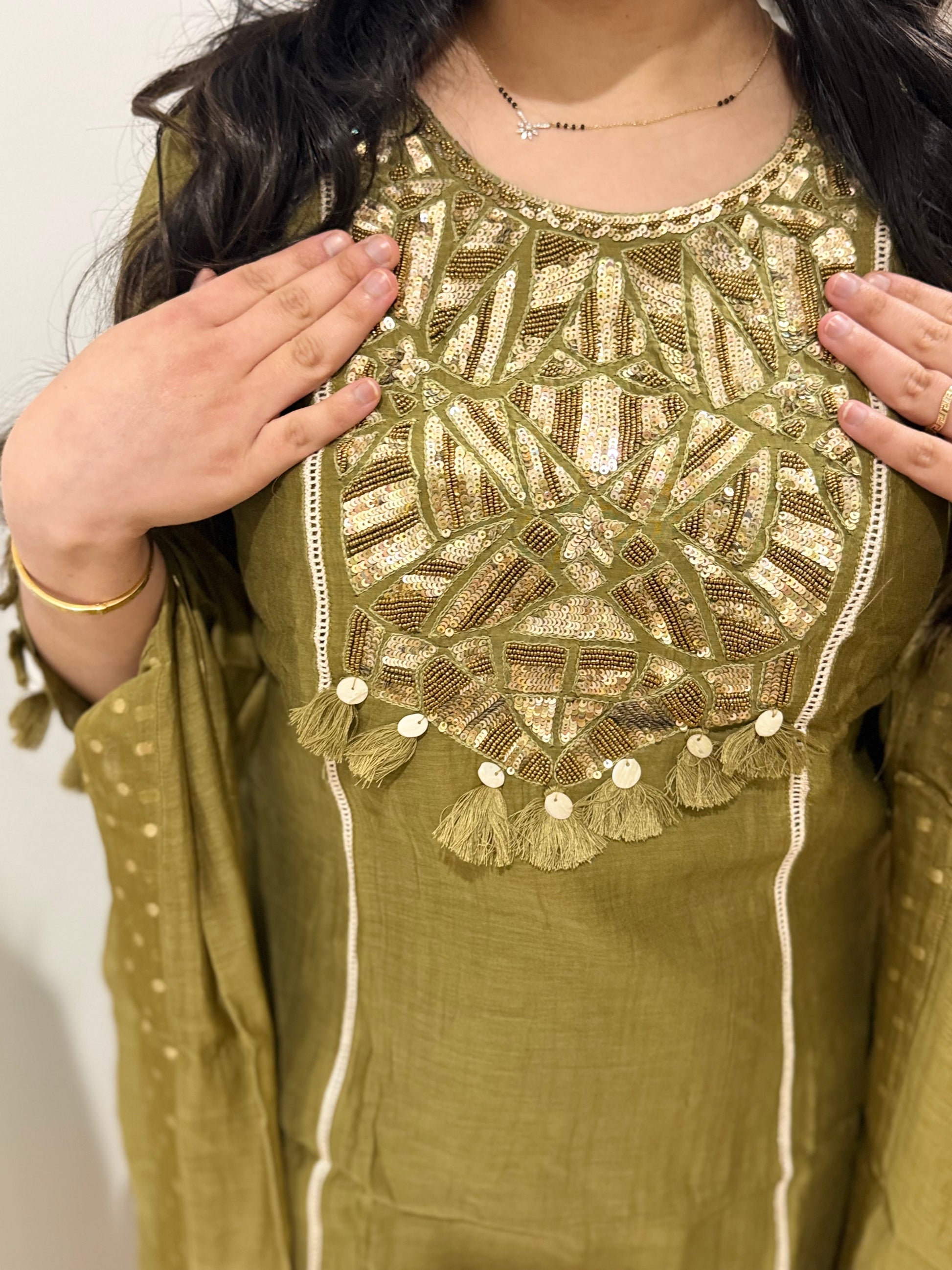 Premium quality mul chanderi anarkali suit with lining and handwork on the yoke and sleeves. Luxury dupatta on mulchanderi fabric and straight pants