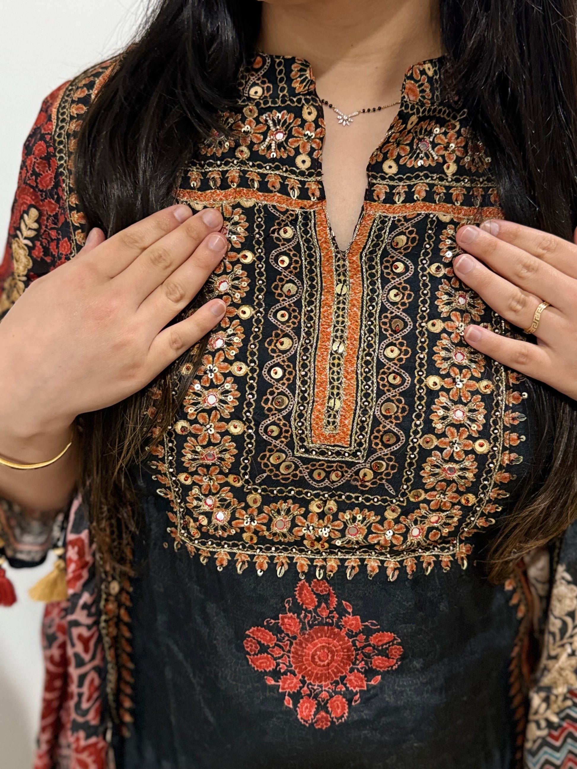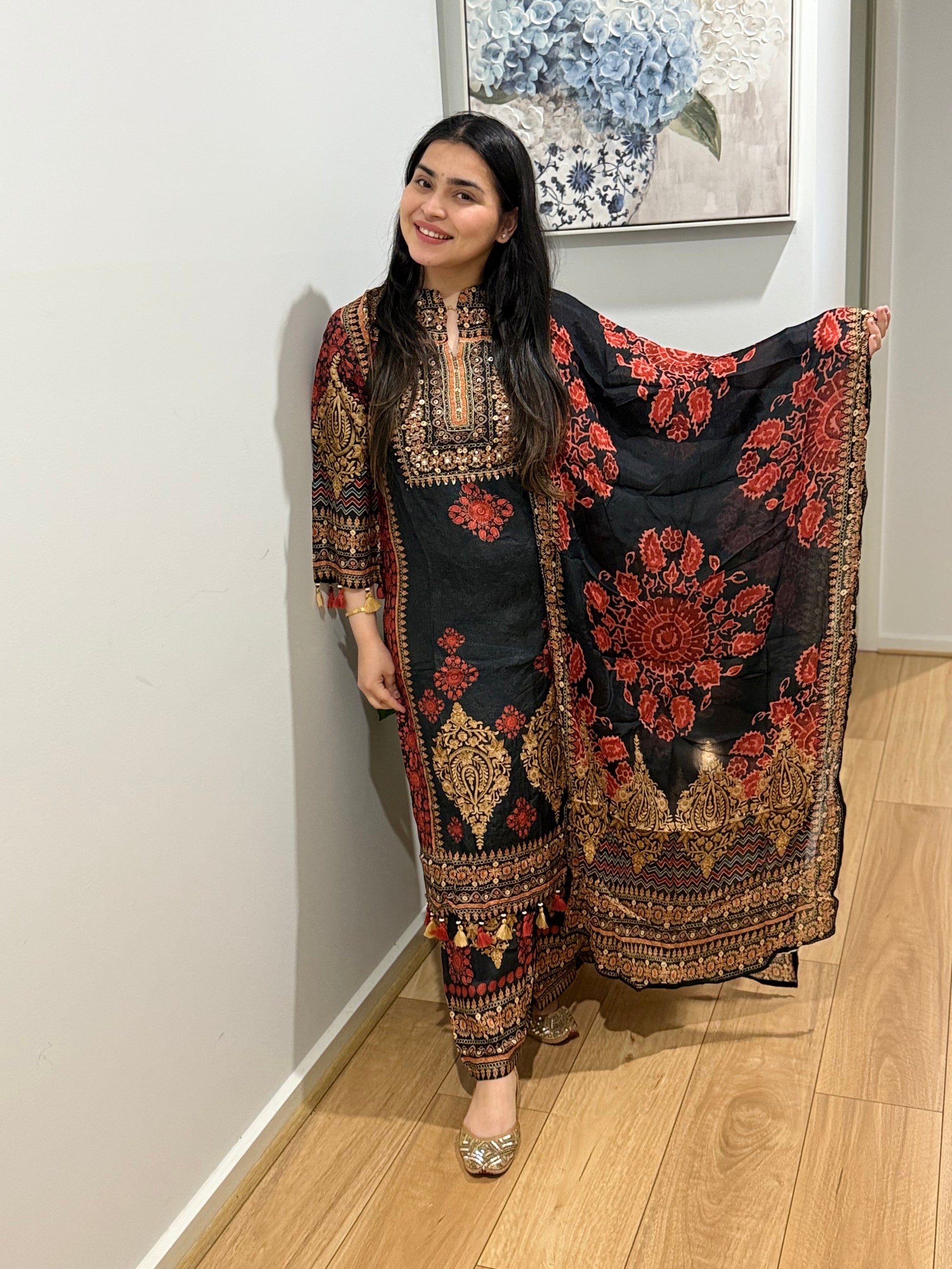 Premium quality digitally printed silk suit with pants and chinnon dupatta