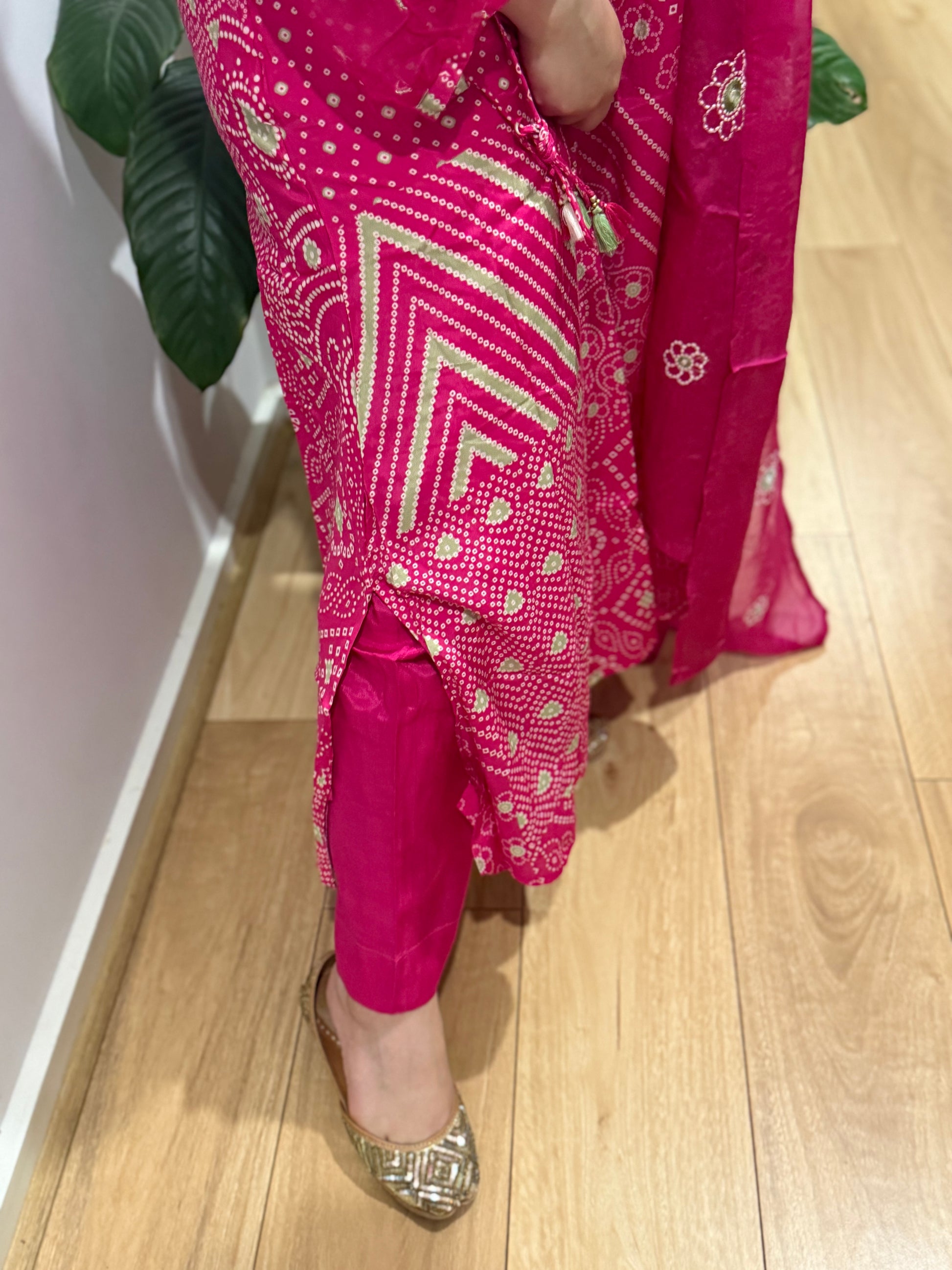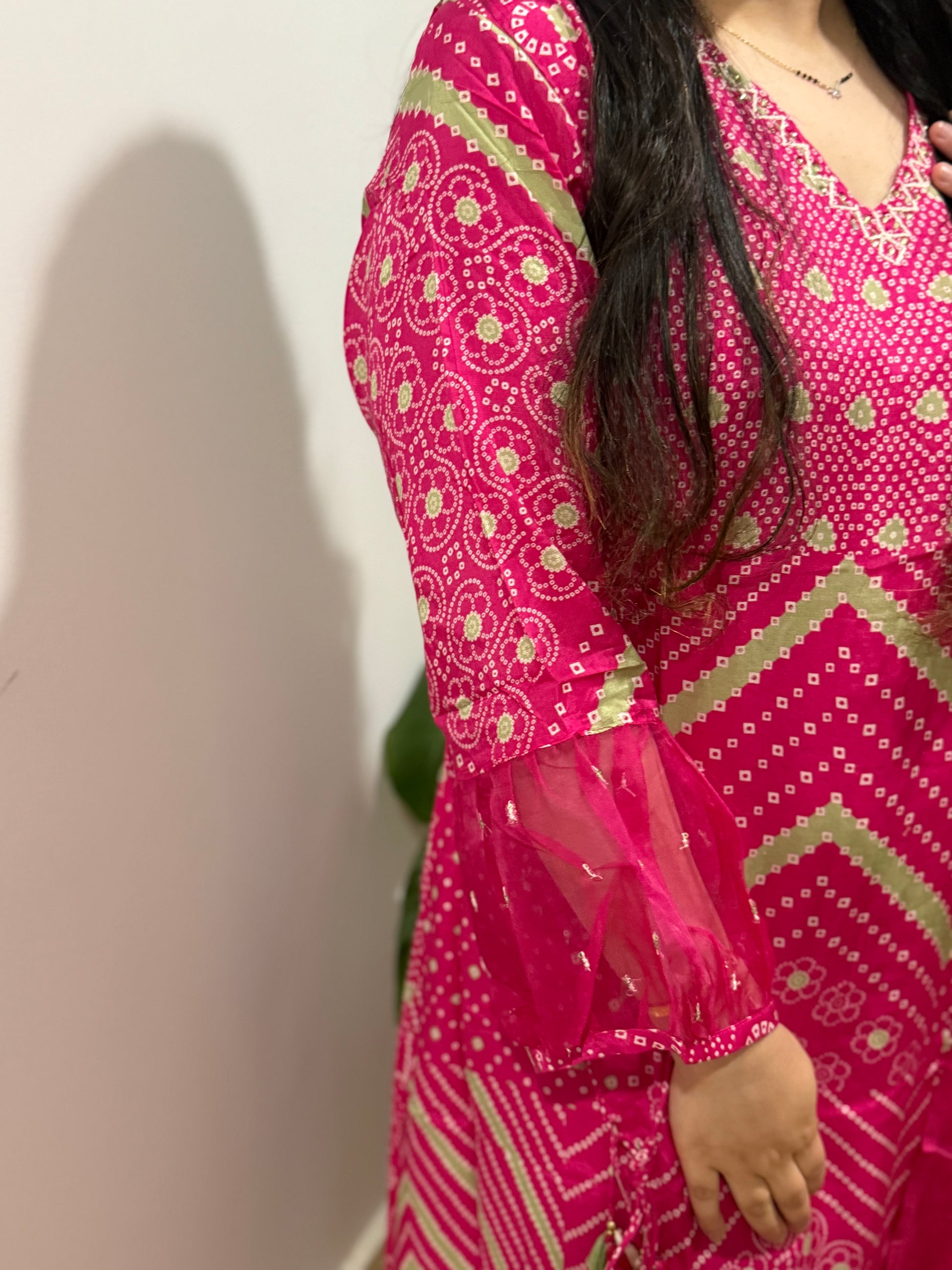 Premium quality silk suit with lining and balloon sleeves. Pants are straight with tissue dupatta