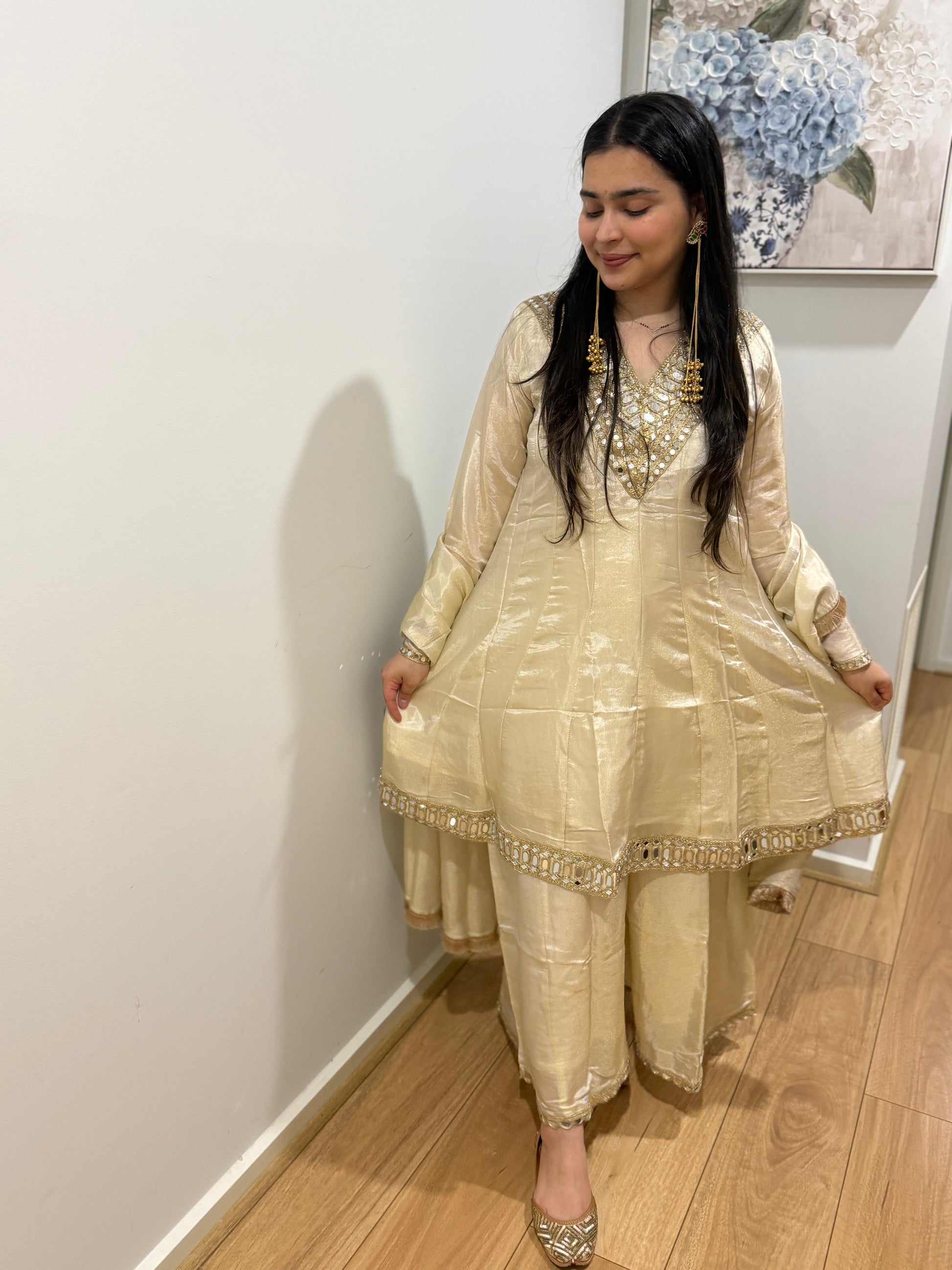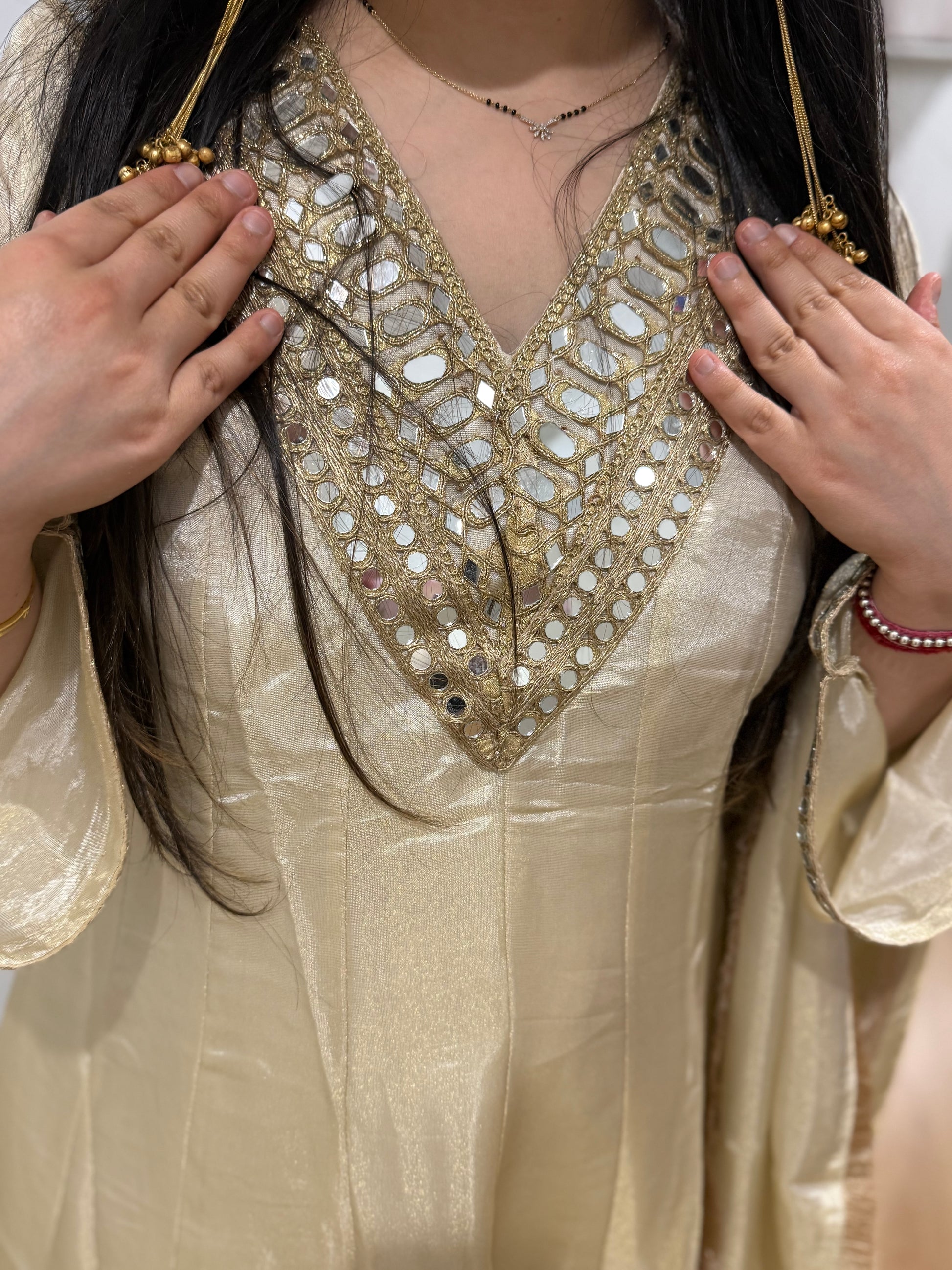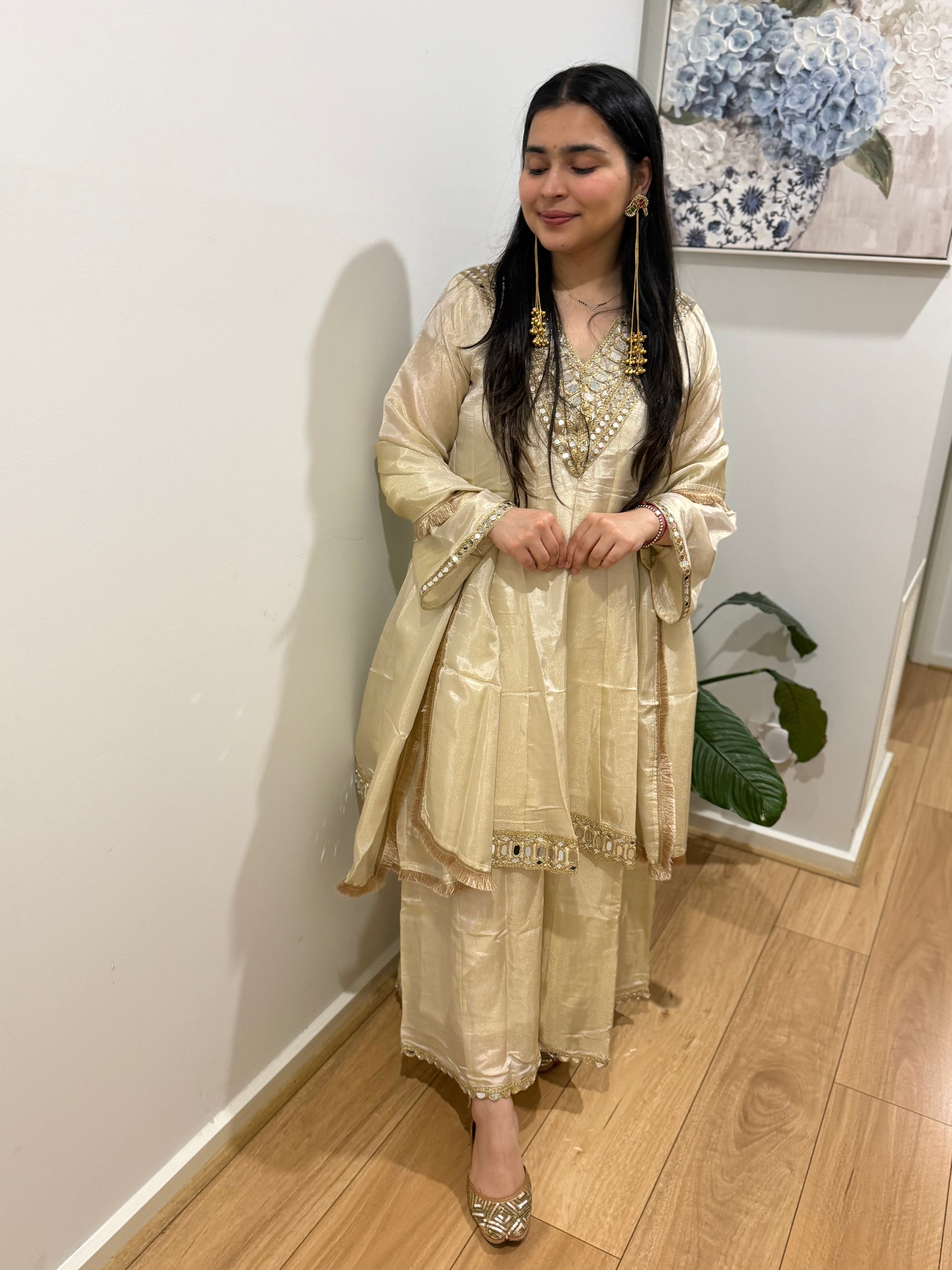 Shimmer fabric with lining, mirror work and divider plazzo and dupatta